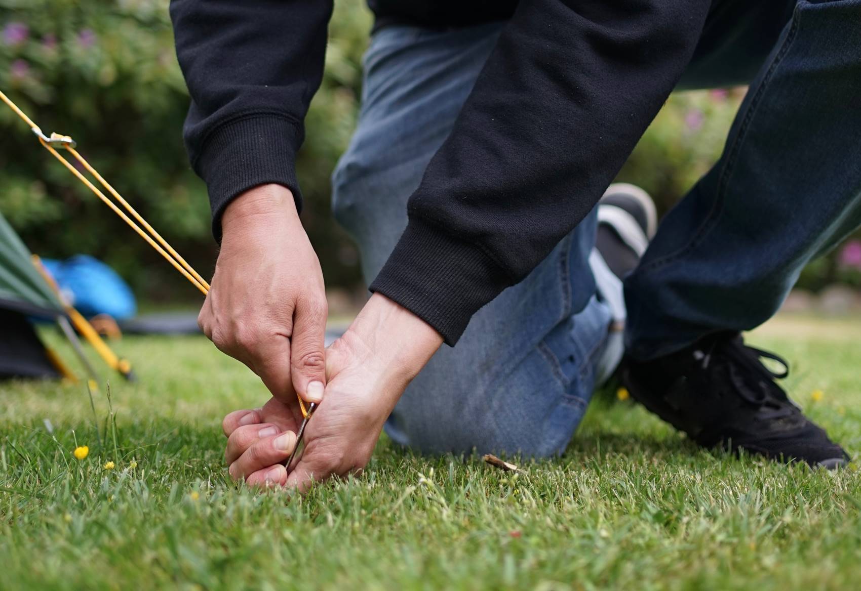Die Heringe können Sie gut einen halben Meter entfernt von der Grundfläche platzieren, bei größeren Zelten auch mehr. An diesen zusätzlichen Platzbedarf sollten Sie bei der Wahl des Zeltplatzes denken. Schlagen Sie nämlich Ihre Heringe dort ein, wo immer wieder Menschen unterwegs sind, werden Sie nachts möglicherweise von einem wackelnden Zelt und Flüchen geweckt. Aber auch das eigene Team vergisst gern, wo die Heringe eingeschlagen wurden. Der Markt hat auch dieses Problem schon erkannt: Leuchtende und reflektierende Leinen sowie Fähnchen für die Heringe machen auf die Stolperfalle aufmerksam.