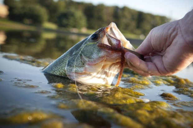 Damit die Schnur das Seerosenblatt nicht unter Wasser drückt, macht man sehr vorsichtige und leichte Zupfer. Dies genügt in der Regel, um eine Sedimentwolke aufzuwirbeln und die Barsche anzulocken. Dieselbe Technik kann man auch an versunkenen Bäumen und beim Vertikalangeln an Spundwänden oder von den Stegen anwenden. Beim Angeln mit Carolina Rig beißen die Barsche manchmal sehr vorsichtig, was sich anfühlt, als ob man einen Krauthänger hätte.