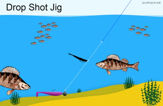 An solchen Tagen kann eine andere Drop-Shot Variante Abhilfe schaffen – der sogenannte Drop-Shot Jig. Hierbei fundiert ein mit Jigkopf bestückter Gummifisch sowohl als Bleigewicht als auch als Köder. Die Zupf-Bewegungen, mit denen der Angler den Drop-Shot Köder animiert, werden auch an den Jig geleitet, sodass dieser den Fischen ebenso ein Leckerbissen suggeriert.