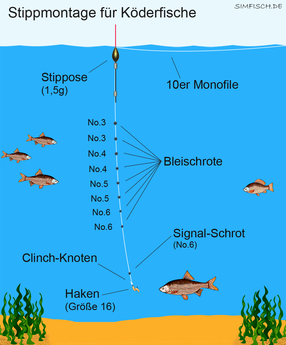 Es gibt diverse Methoden, um die kleinen Weißfische oder andere Arten zwecks Anköderung zu fangen. Mit der Stipprute Köderfischen nachzustellen ist die beste Möglichkeit, kleine wie auch größere Fischchen für die Jagd auf Raubfische an Land zu holen. Dafür braucht man neben dem passenden Köder (z.B. Maden, Teig oder Mais) eine sehr feine Montage. In folgender Abbildung sehen Sie, wie eine Stippmontage fürs Fangen der Köderfische aufgebaut ist.
