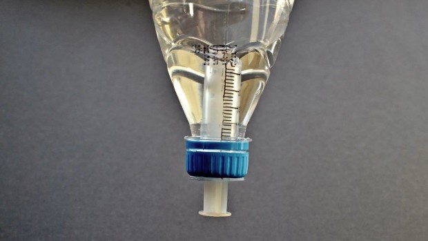 Jetzt wird die Spritze in die ausgeschnittene Deckel-Öffnung eingeführt: